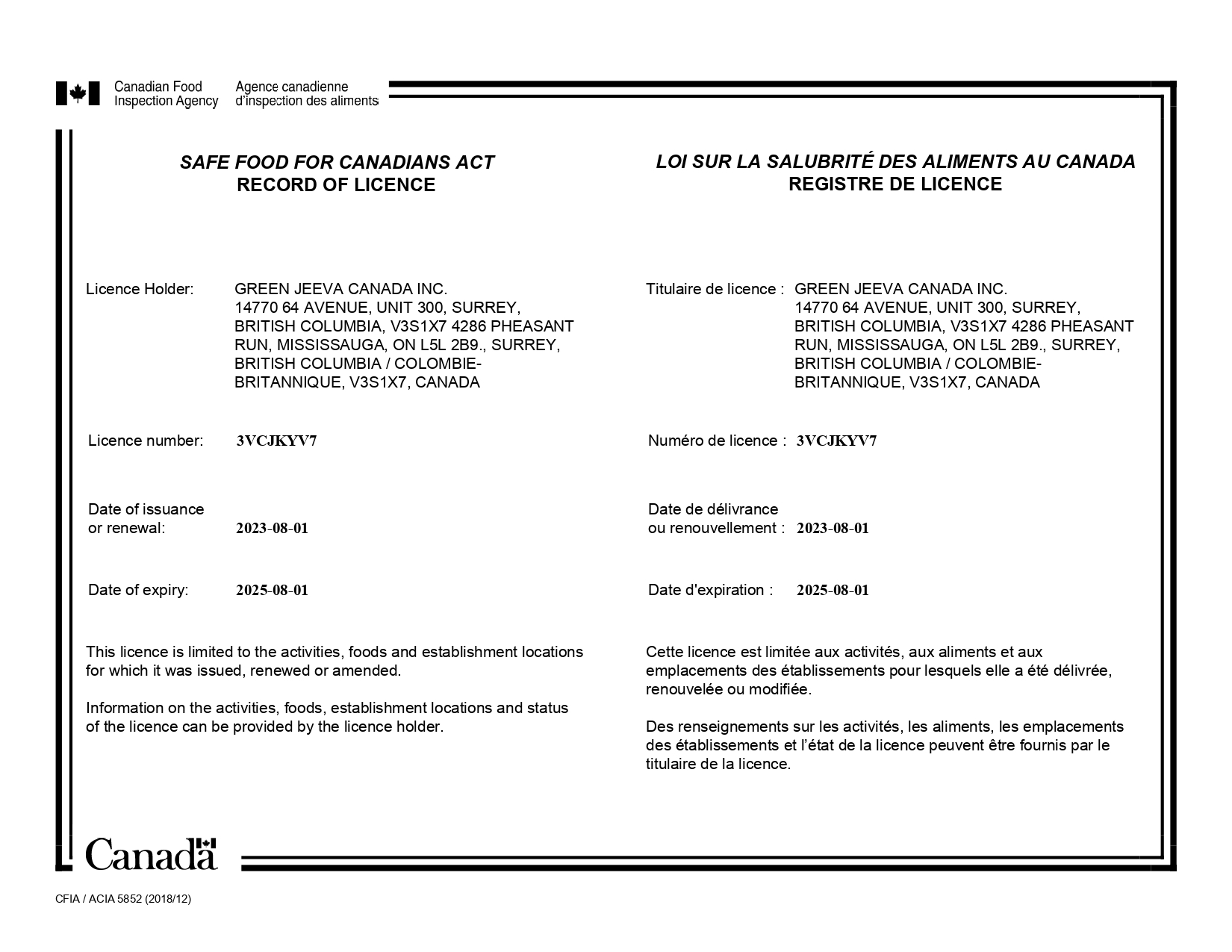 Green Jeeva Canada INC. is honoured to have received certification from the Canadian Food Inspection Agency (CFIA), reaffirming our dedication to upholding Canada’s highest food safety and regulatory standards.