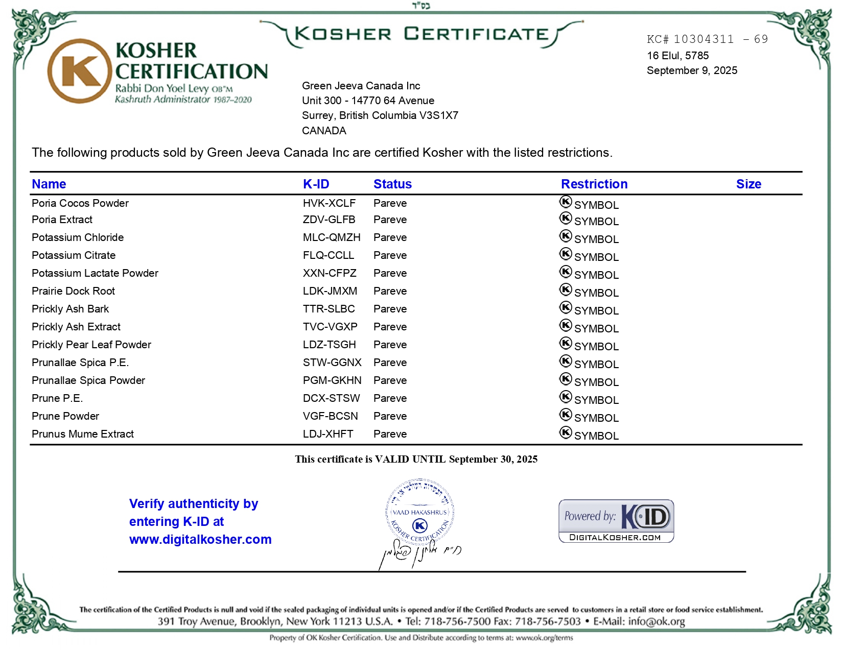 Green Jeeva Canada INC. holds Kosher Certification, a testament to our unwavering commitment to offering products that comply with the dietary laws of Kashrut. This certification ensures our ingredients are carefully sourced and processed to meet kosher standards, providing you with a reliable and high-quality product.