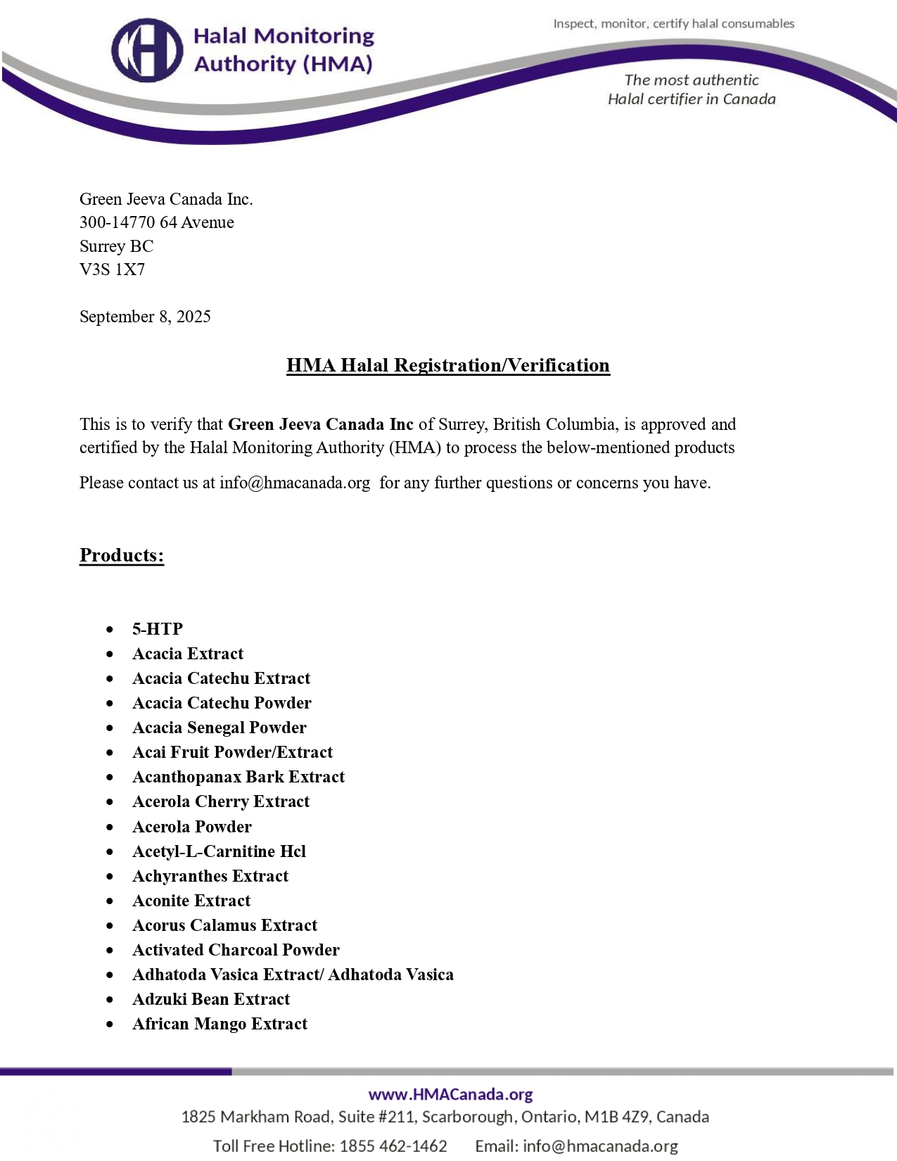At Green Jeeva Canada Inc., we proudly hold the Halal Certificate from the Halal Monitoring Authority (HMA). This prestigious certification underscores our unwavering commitment to providing top-quality, Halal-certified ingredients to our customers.