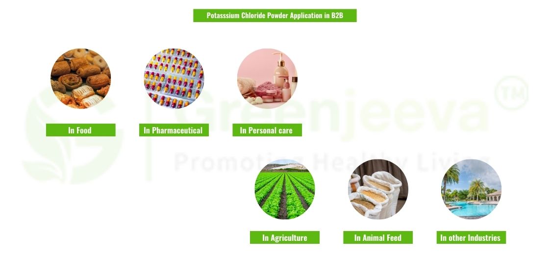 Potassium Chloride can be used in Food, Beverage, Pharmaceutical, Health & Personal care products, Agriculture/Animal Feed/Poultry. Potassium chloride is a mineral supplement used to treat or prevent low levels of potassium in the blood. Potassium Chloride is often used as a flavor enhancer, stabilizer, and thickener in cheese, fat spreads, processed fruit, dried vegetables, etc.